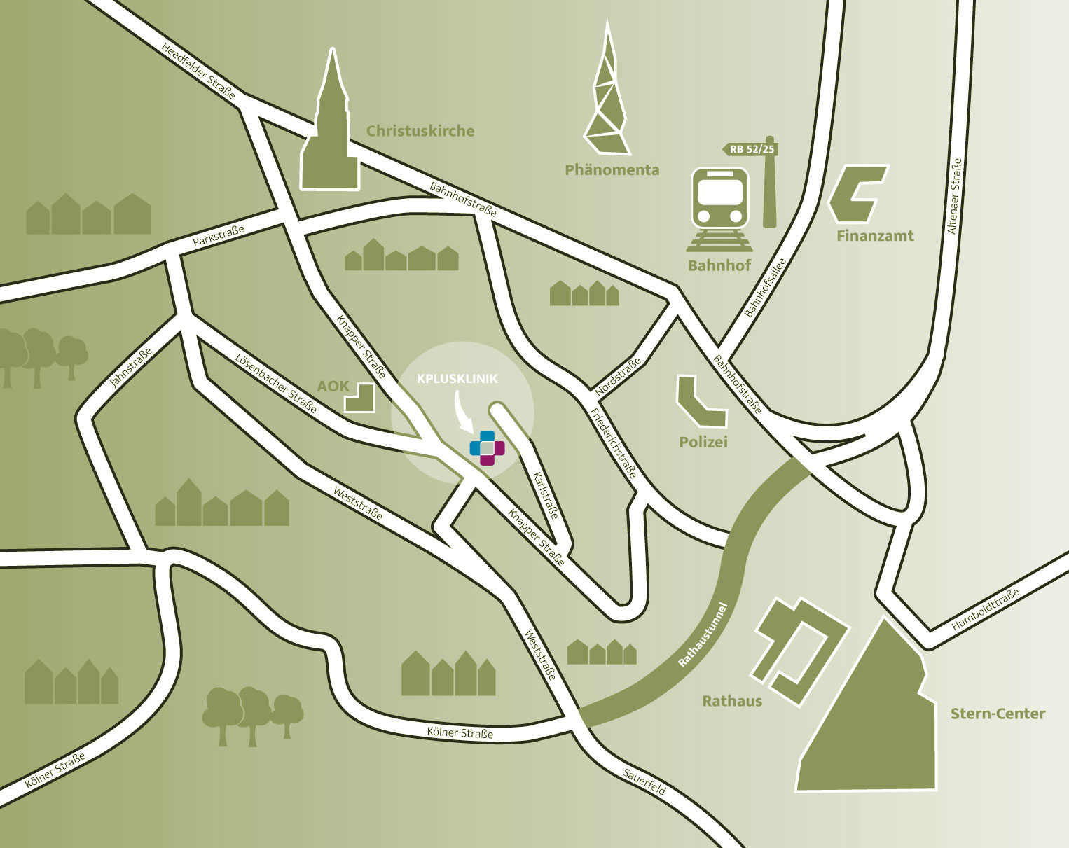 Die KPLUSKLINIK befindet sich am „Lüdenscheider Knapp“. Vorbei an der Christuskirche gelangen Sie in die Knapper Straße, von der aus die Praxisräume ebenfalls zugänglich sind. Bis zur Einmündung in die Karlstraße sind es ca. 500 m, sie finden uns auf der linken Seite, Hausnummer 9 – 11, Parkmöglichkeiten stehen dort zur Verfügung.